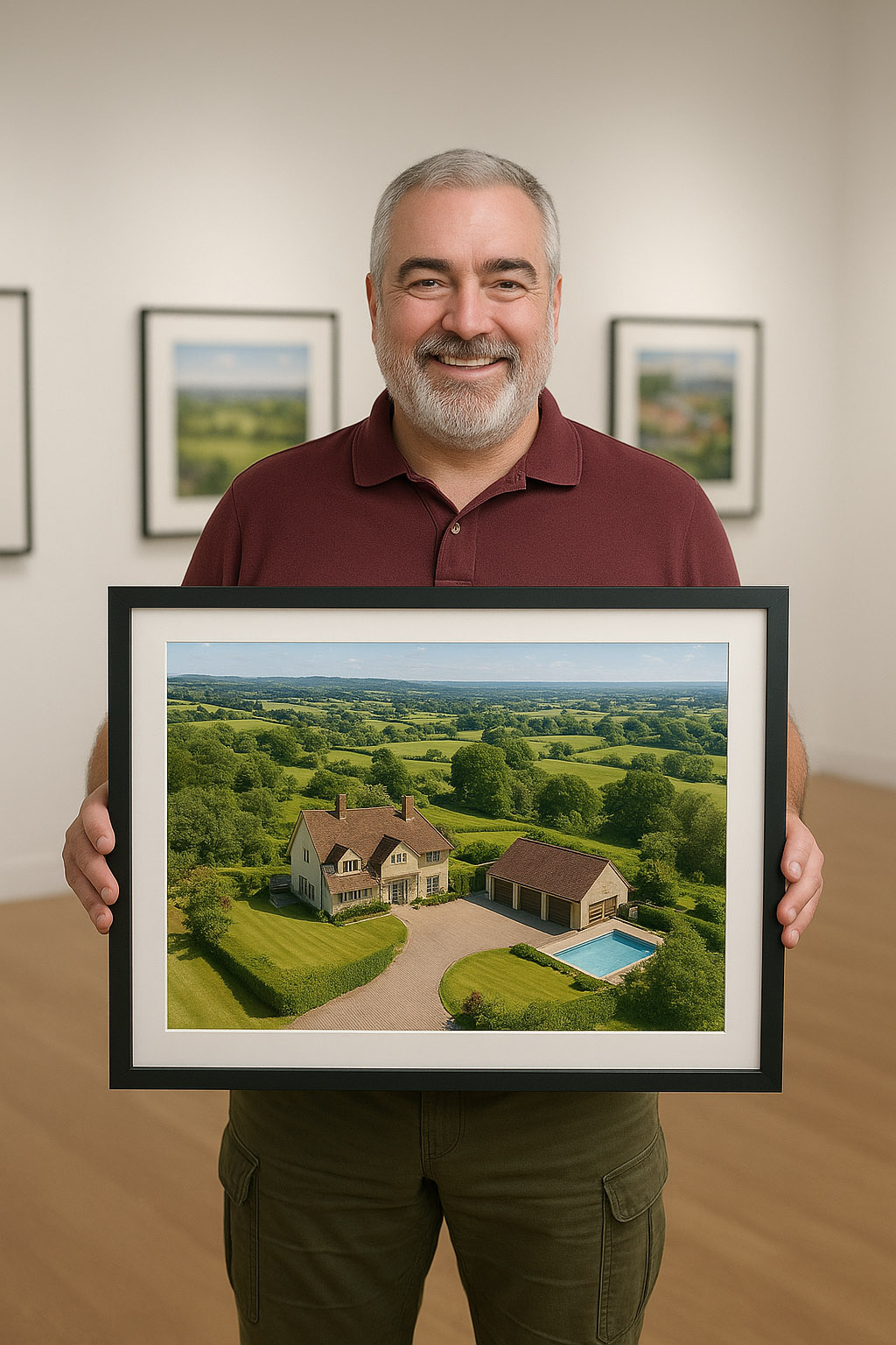 We can produce beautiful photos of your home, taken with our Drone – and printed at either A2 (594mm x 420mm) or A3 (420mm x 297mm). The prints will come framed, printed on high-quality photo paper which should last for 200 years.